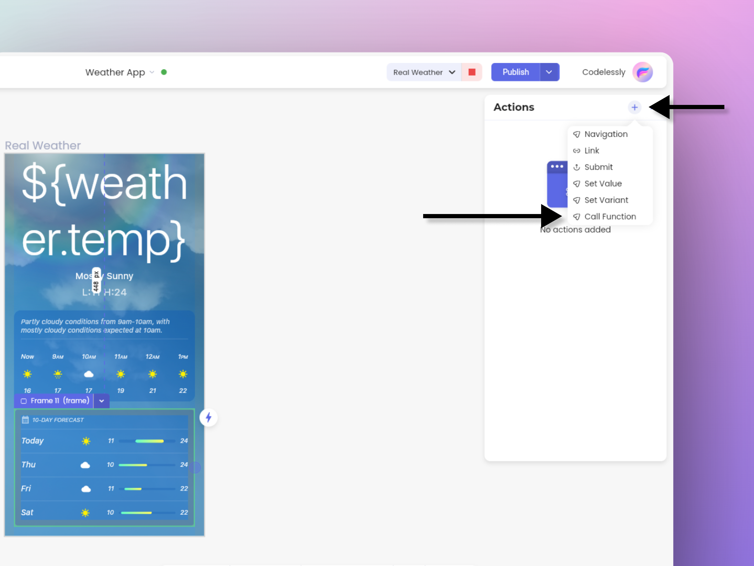 `CodelesslyFunction` has a parameter `call` which is a function with generic return type `T`. Here's an example of how we can declare functions in the widget.