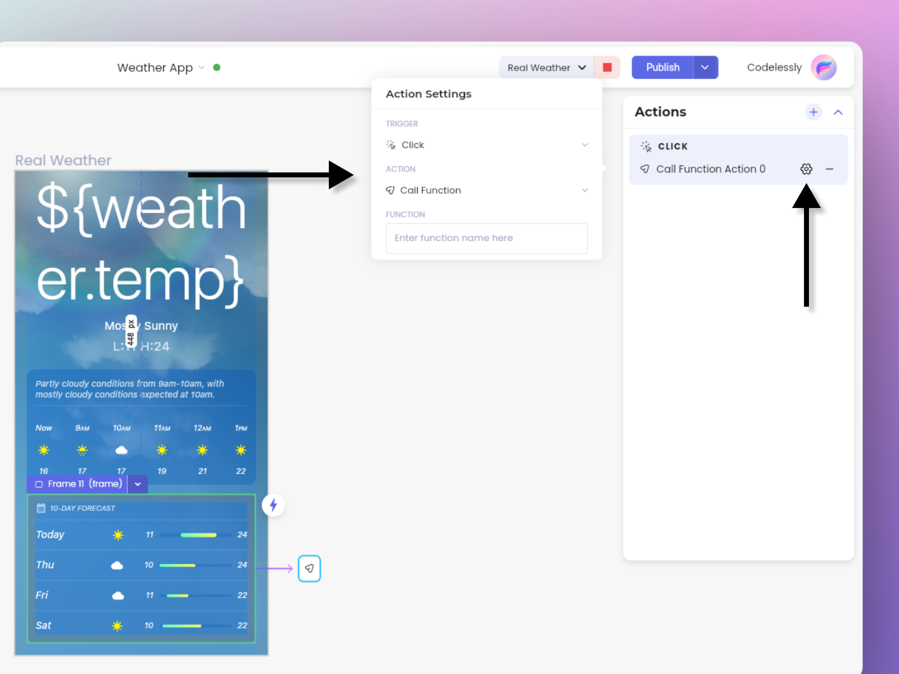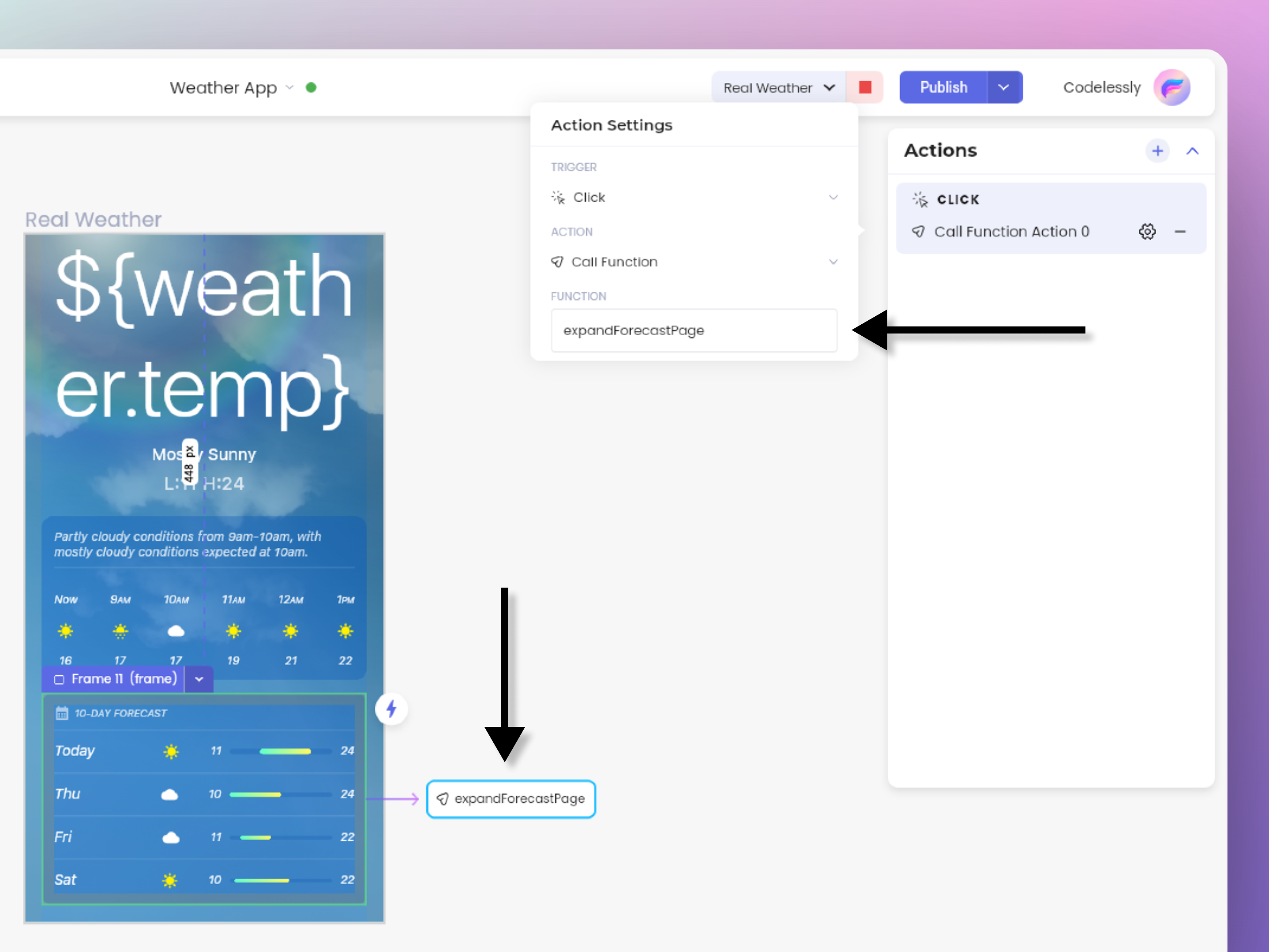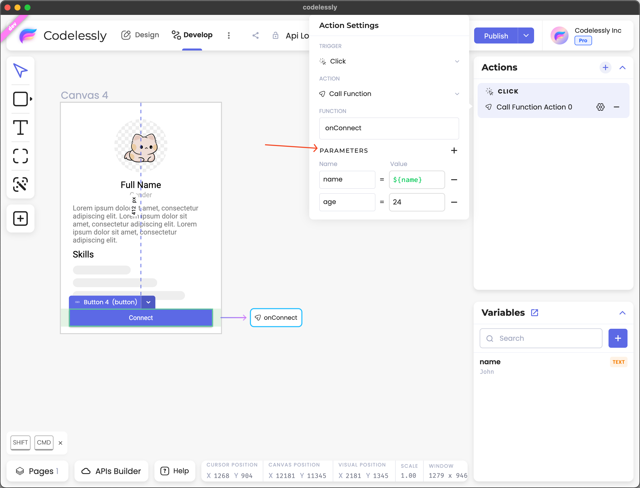 Actions are meant to make the UI more functional. Using actions, you can navigate to a different page, change state of a widget, launch URLs, etc. In this case, we need to call a custom function in the SDK. So, we use the *Call Function* action.