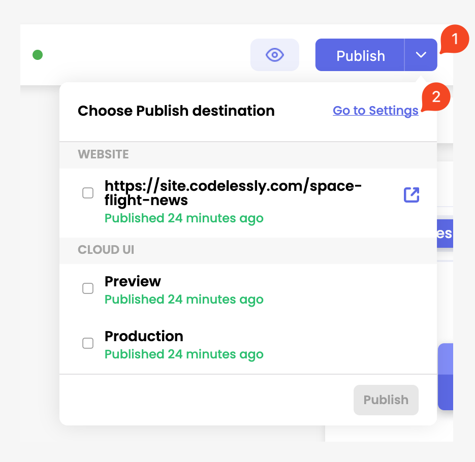 2. Click on arrow button<img src="https://3474078512-files.gitbook.io/~/files/v0/b/gitbook-x-prod.appspot.com/o/spaces%2Fx4NeiXalJWaOaV6tsK5f%2Fuploads%2Fr2o7hi8HOfoy34RiTiB7%2Fimage.png?alt=media&#x26;token=7e7960aa-c6cb-4734-80ea-e4d373dd2a81" alt="" data-size="line"> next to publish button and click on `Go to Settings`.
